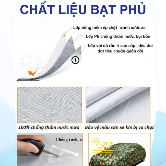 - Chất liệu bạt phủ: vải dù Polyester Oxford Fabric được bọc tráng nhôm cao cấp, có độ bền lên đến 3 năm.