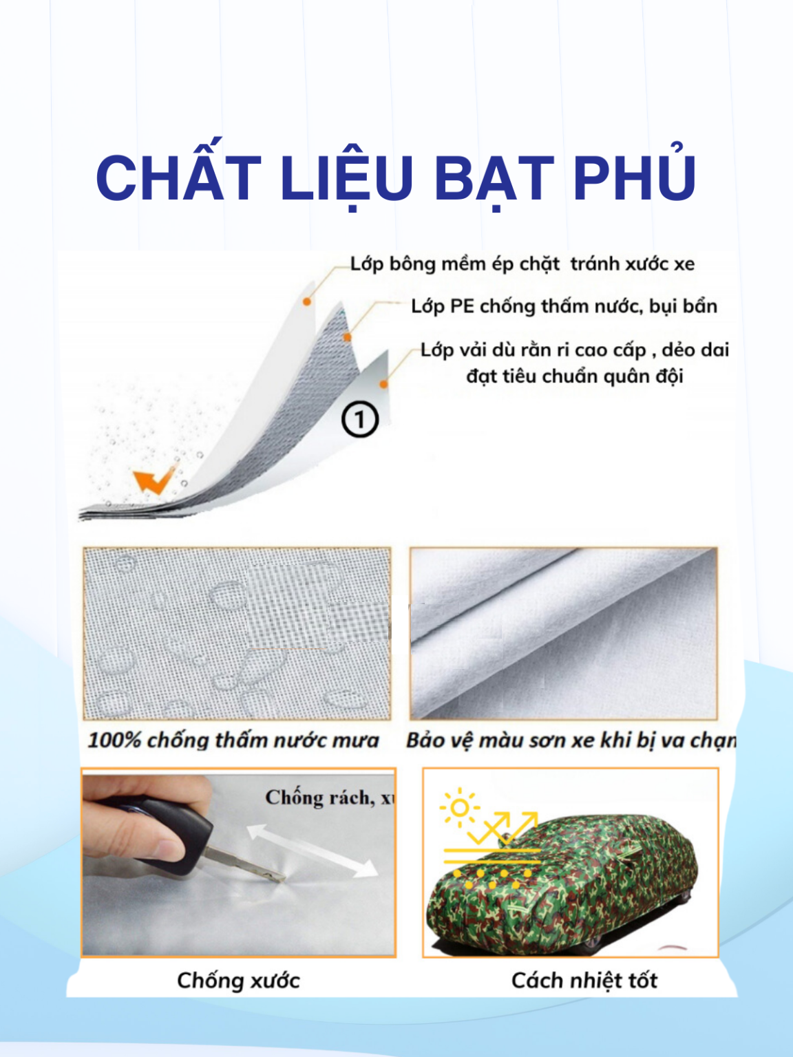 - Bạt phủ cũng chống bụi bẩn, trầy xước, vẽ bậy, thậm chí là trộm gương xe. Bụi bẩn từ sự ô nhiễm của môi trường, trầy xước do va chạm, và rất nhiều trường hợp bất khả kháng khác có thể khiến ô tô của chúng ta bị xuống cấp nhanh chóng. Vì vậy, sử dụng bạt phủ sẽ giúp ô tô được bảo vệ toàn diện, tăng tuổi thọ cho xe và giảm chi phí bảo dưỡng.
