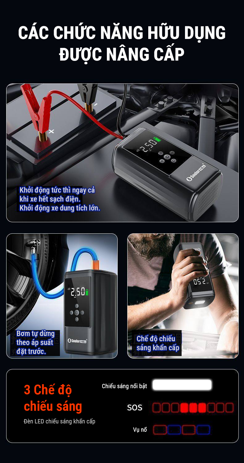 - Bơm lốp kiêm kích bình Black Soulor dùng để bơm lốp ô tô khi xe bị non hơi và kích nổ động cơ khi bình ắc quy bị hết điện do nguyên nhân khách quan. Với công suất bơm mạnh mẽ, lốp xe sẽ nhanh chóng được cung cấp áp suất cần thiết, giúp xe của bạn tiếp tục hành trình một cách an toàn và ổn định.