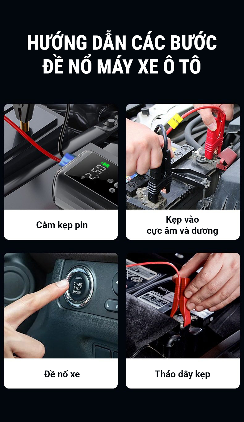 Sản phẩm được tích hợp viên pin có dung lượng lên đến 6400mAh, dòng điện kích là 1000A nên kích được cho hầu hết các dòng xe ô tô. Đối với động cơ xe xăng là dưới 4.0L và xe dầu là dưới 2.0L.