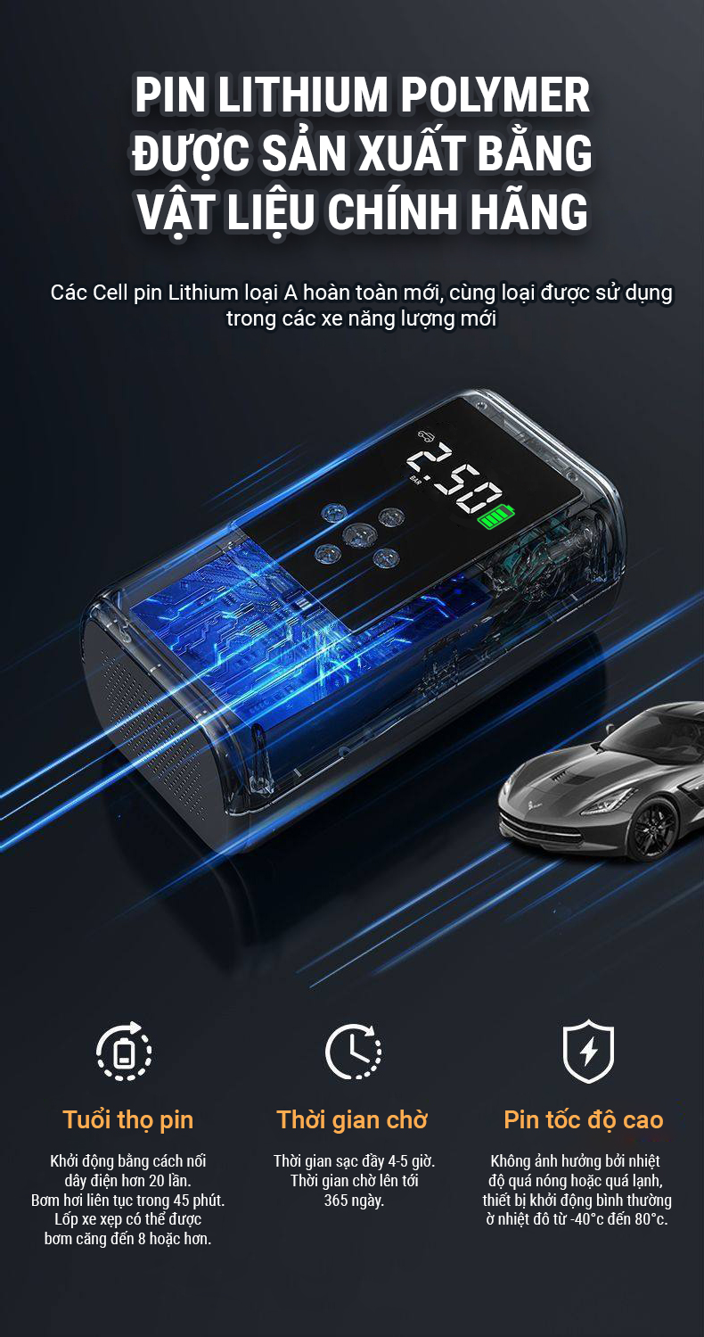 - Do có thiết kế dung lượng pin lớn nên sản phẩm dễ dàng kích bình và bơm lốp cho hầu hết các dòng ô tô, xe hơi hiện nay tại Việt Nam đặc biệt là các dòng xe từ 4 đến 7 chỗ.