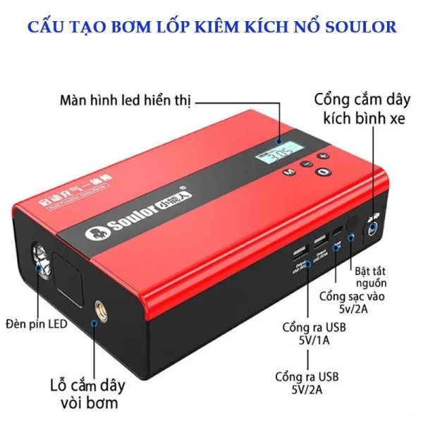 - Kích bình kiêm bơm lốp ô tô Soulor được tích hợp rất nhiều tính năng thông minh như: Bơm lốp tự ngắt đi đủ áp suất lốp, màn hình LED hiển thị sắc nét, đèn chiếu sáng ban đêm, sạc điện thoại.