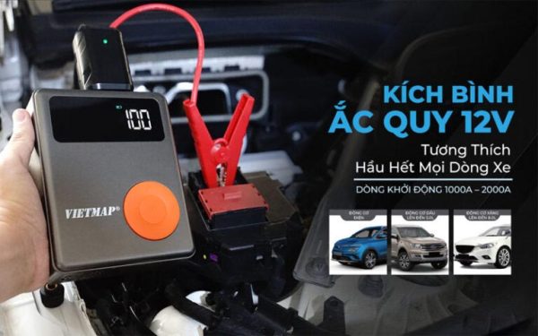 - Bơm lốp kiêm kích bình ô tô vietmap có dung lượng Pin đến 12.000mAh với dòng khởi động từ 1000 đến 2000A tương thích với tất cả các dòng xe gia đình hiện tại trên thị trường, bao gồm cả xe điện, xe động cơ xăng, xe động cơ dầu