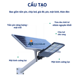 - Tấm pin năng lượng mặt trời: Tấm pin gồm nhiều tế bào quang điện có vai trò hấp thụ ánh sáng mặt trời để chuyển hóa quang năng thành điện năng rồi lưu trữ trong pin sạc. Pin sạc: Có vai trò lưu trữ điện năng được truyền từ tấm pin mặt trời vào ban ngày. Khi trời tối, pin sạc sẽ cung cấp năng lượng cho đèn để chiếu sáng.