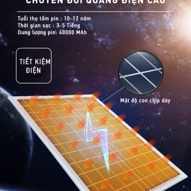 Đèn được trang bị tấm pin Mono 6V/25W có kích thước 530×350×17 mm, tối ưu hóa khả năng hấp thụ ánh nắng và chuyển hóa thành điện năng. Dù thời tiết không thuận lợi, pin vẫn đảm bảo nạp đầy trong 4–6 giờ sạc. Sản phẩm sử dụng pin Iron Aluminum Phosphate dung lượng 30.000mAh – dòng pin cao cấp có tuổi thọ vượt trội, chống chai, chống cháy nổ và an toàn khi sử dụng. Nhờ đó, đèn có thể chiếu sáng liên tục từ 12–15 giờ, đủ cho cả một đêm dài mà không lo tắt giữa chừng.