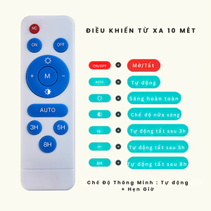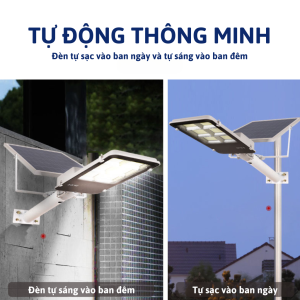 Sản phẩmlà đèn chiếu sáng sử dụng năng lượng mặt trời để chuyển hóa quang năng của ánh sáng mặt trời thành điện năng để cung cấp cho hệ thống đèn chiếu sáng ngoài trời như đường phố, lối đi, khu đô thị, sân cổng, sân vườn, công viên, đường giao thông, sân chơi thể thao, trang trại, vùng sâu vùng xa. Sản phẩm hoạt động theo cơ chế tự sạc pin năng lượng mặt trời vào ban ngày và khi trời tối đèn sẽ tự động chiếu sáng bằng nguồn điện dự trữ trong pin sạc lúc ban ngày. Đèn được thiết kế chắc chắn, thân đèn bằng nhôm cao cấp, đèn có mắt led siêu sáng. Đầu tư một lần dùng trên 10 năm.
