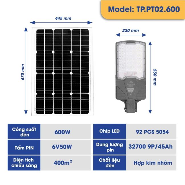 Chiếu sáng mạnh – Độ phủ rộng tới 400–600m²: Sử dụng chip LED 5054 cao cấp, cho ánh sáng mạnh, đều và lan tỏa khắp không gian lớn. Cấu hình vượt trội – Hoạt động bền bỉ: Trang bị pin lithium lưu trữ dung lượng cao, đảm bảo chiếu sáng liên tục từ 10–15 tiếng, hoạt động ổn định kể cả trong điều kiện mưa bão