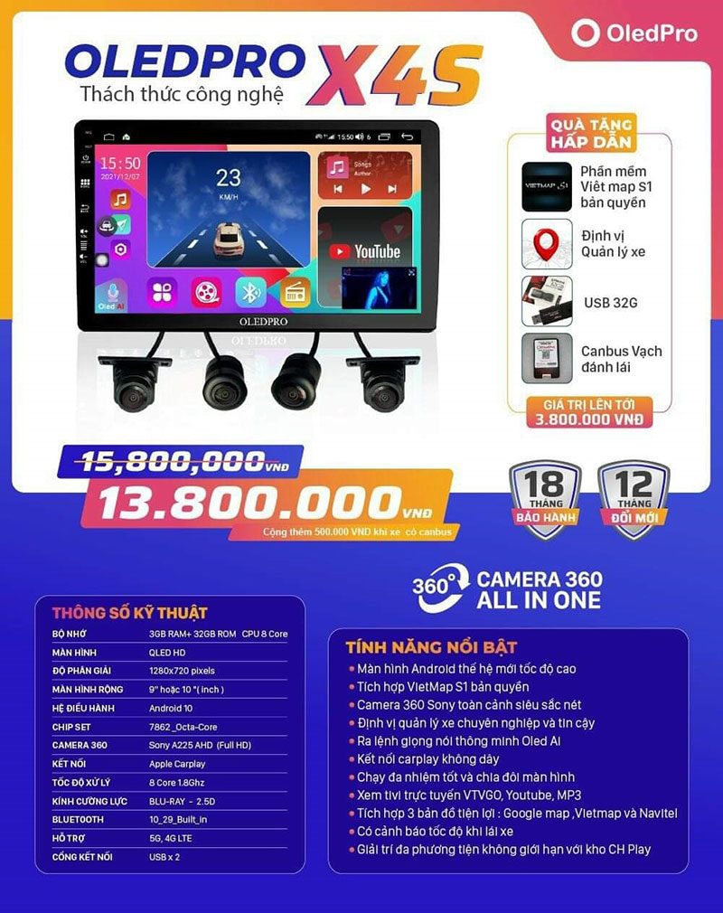 OledPro chính là thương hiệu tiên phong trong việc đưa chất lượng sản phẩm cao cấp và sự trải nghiệm đích thực đến phân khúc tầm trung. Trên sản phẩm OledPro X4S được trang bị 4 Camera 360 Sony A225 bốn vị trí (trước, sau và hai bên gương) với chíp lens Sony siêu sắc nét.
