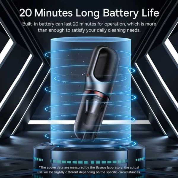 - Máy hút bụi không dây Baseus A7 được trang bị viên pin 2000mAh nên giúp bạn hút bụi trong thời gian dài mà không phải lo bị hết pin. Thời gian sử dụng là 3.5 giờ, đây là con số rất lớn đối với máy hút bụi không dây.