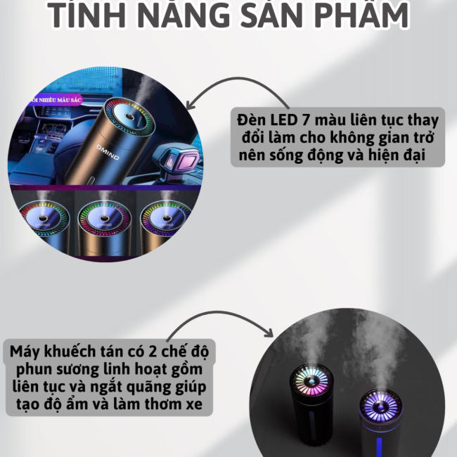 - Sản phẩm sử dụng công nghệ phun sương tiên tiến, giúp lan tỏa tinh dầu đều khắp mọi ngóc ngách trong xe, loại bỏ hiệu quả các tác nhân gây mùi như vi khuẩn, nấm mốc, bụi bẩn,…