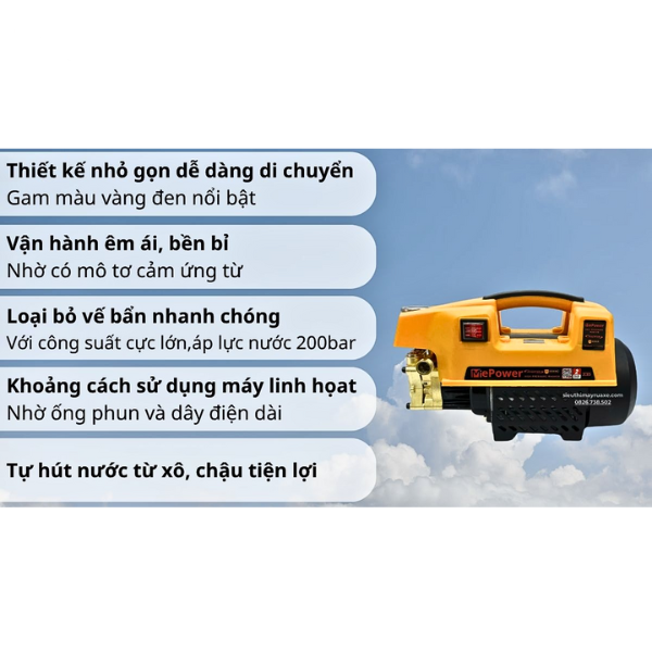 Máy rửa xe là thiết bị phun xịt áp lực cao giúp làm sạch nhanh các bề mặt bám bụi bẩn, dầu mỡ hay rong rêu bằng sức mạnh của dòng nước nén. So với cách rửa thủ công, máy rửa xe có khả năng tiết kiệm nước, tăng hiệu quả làm sạch và giảm đáng kể công sức cho người dùng. Thiết bị này hiện được sử dụng rộng rãi trong gia đình, tiệm rửa xe, nông trại và các công trình nhờ sự tiện lợi, gọn nhẹ và độ bền cao