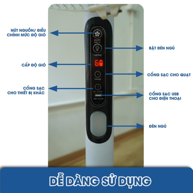 - Thiết kế dễ sử dụng: Bảng điều khiển trực quan, điều chỉnh tốc độ gió, đèn ngủ, kiểm tra pin