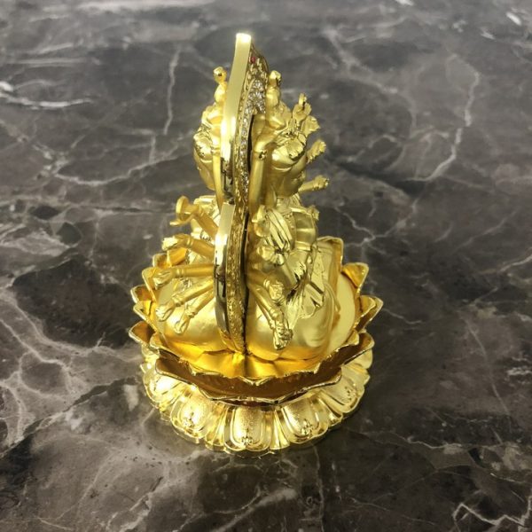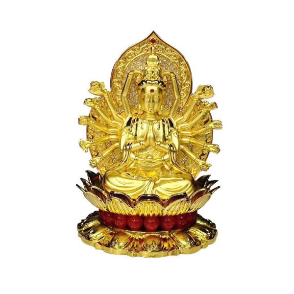 Tượng Quan Âm nghìn mắt nghìn tay 2 mặt được làm từ hợp kim và sơn mạ màu vàng rất sang trọng, đế sen được đính đá đỏ nổi bật. Phần hào quang được sơn đỏ và nạm đá trắng lấp lánh vô cùng tinh xảo, bắt mắt, giúp vẻ đẹp của Quan Thế Âm thêm tỏa sáng.
